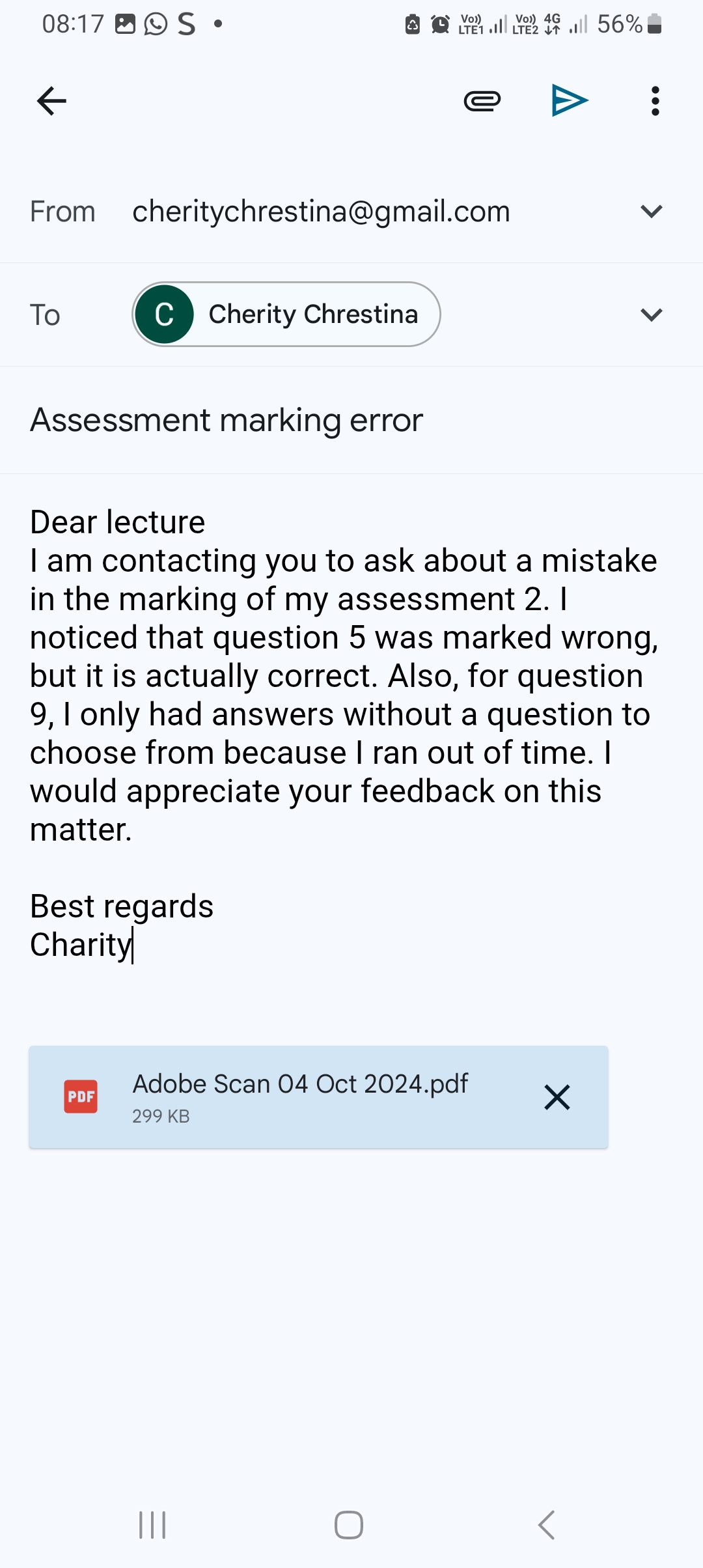 Send an email to yourself but write it as if you are writing to your lecturer asking a question about one of your assessments. The email must have an attachment.